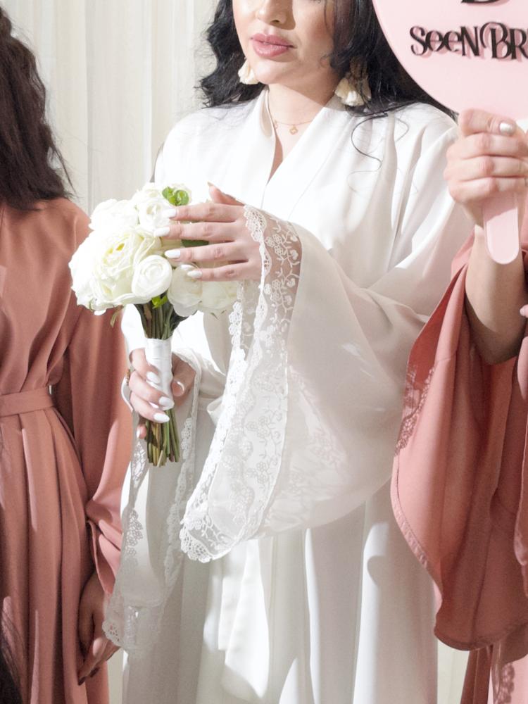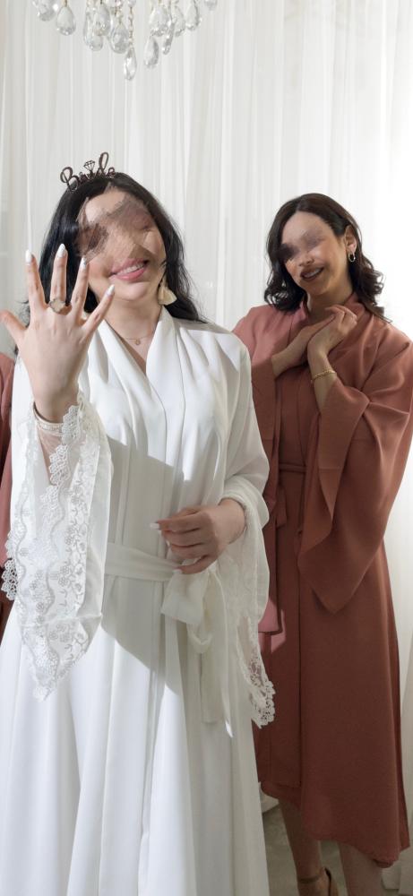 ١ روب ابيض بقصه كلوش وتفاصيل دانتيل انيقه بالاكمام